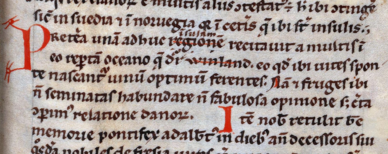 Ausschnitt aus einer mittelalterlichen Handschrift (13. Jahrhundert) der Hamburgischen Kirchengeschichte von Adam von Bremen mit der Erwähnung von »winland« (fol. 82 r). Quelle: Österr. Nationalbibliothek